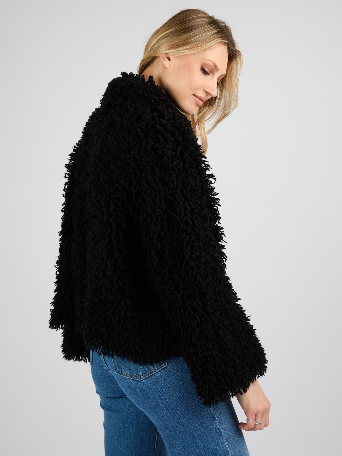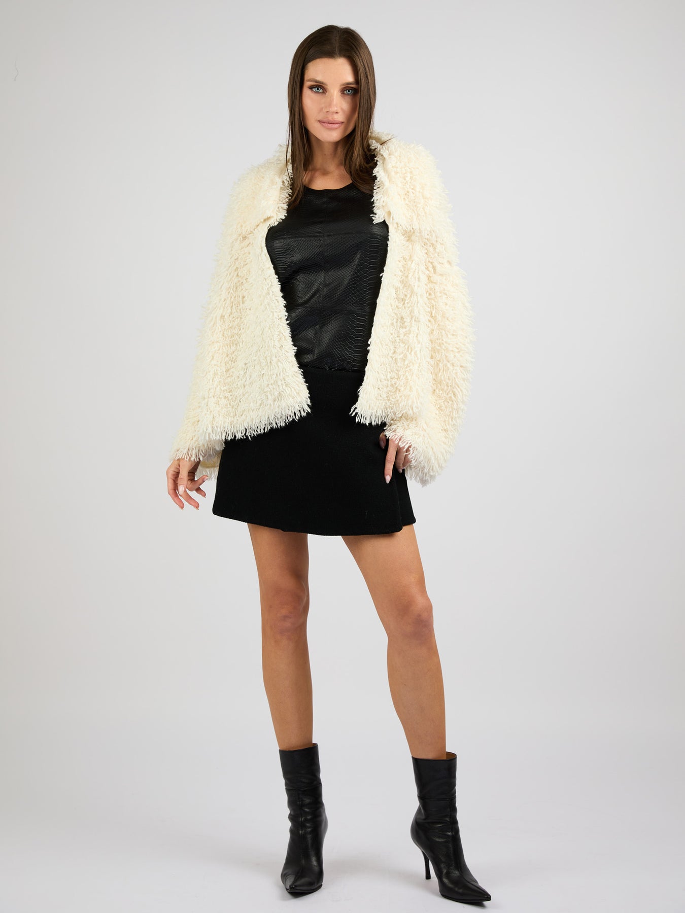 The CORTINA COAT is a sophisticated cropped jacket that hits perfectly at the waist, crafted from 100% Mongolian cashmere. Its loop stitch technique creates a distinctive fur texture effect. Complemented by long bell sleeves and a classic camp collar, making this piece both fashionable and refined. Ideal for those seeking elegance and comfort in one luxurious garment.