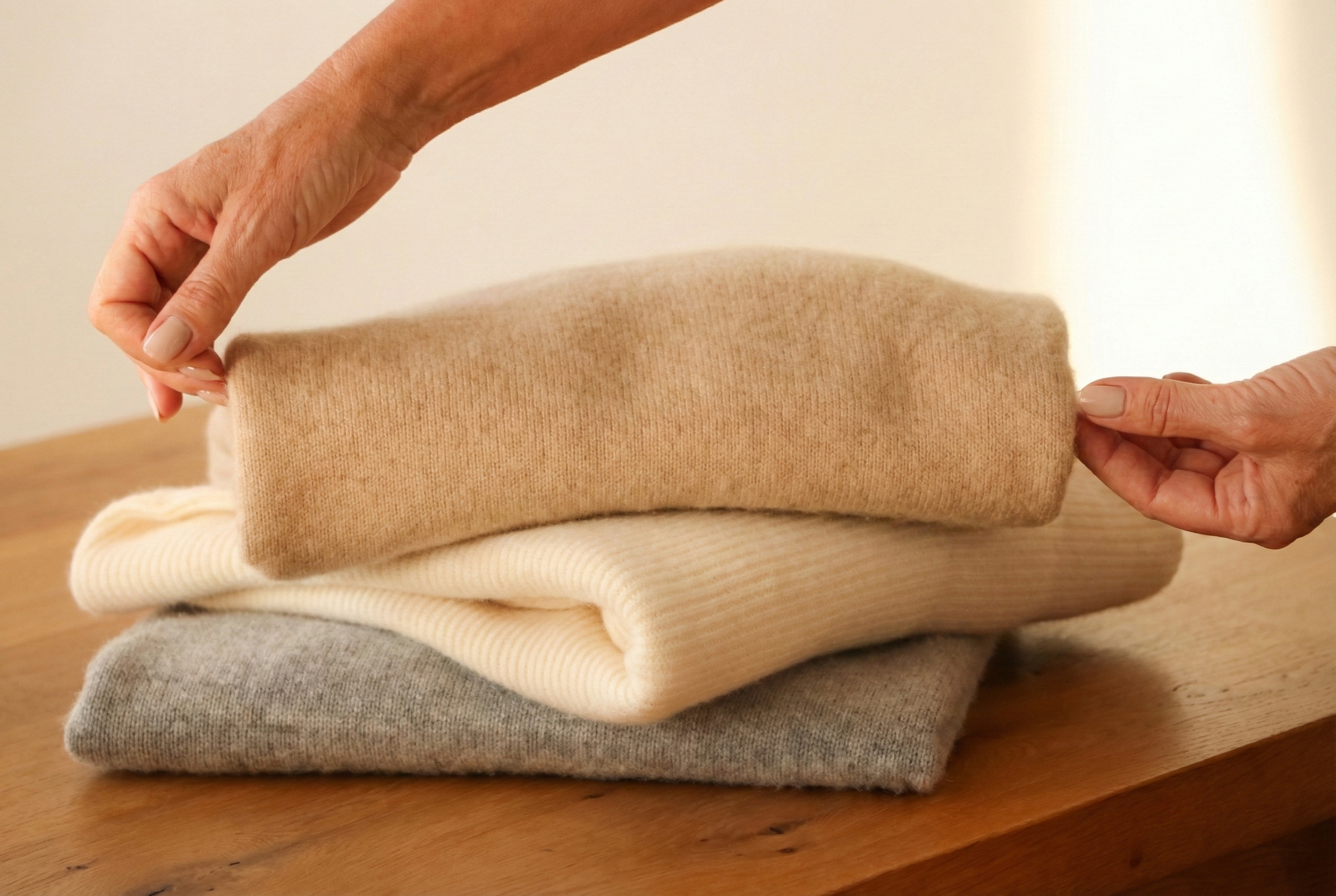 Cashmere is soft, delicate, and meant to be treasured. Handle each piece gently, follow the care instructions on the label, and avoid harsh washing. Most garments can be hand-washed in cold water with a mild detergent or professionally dry-cleaned. Lay them flat to dry and fold rather than hang to preserve their shape. With this care, your sweaters, scarves, and cardigans stay soft, cozy, and ready to be enjoyed for years. See our full cashmere care guide here.
