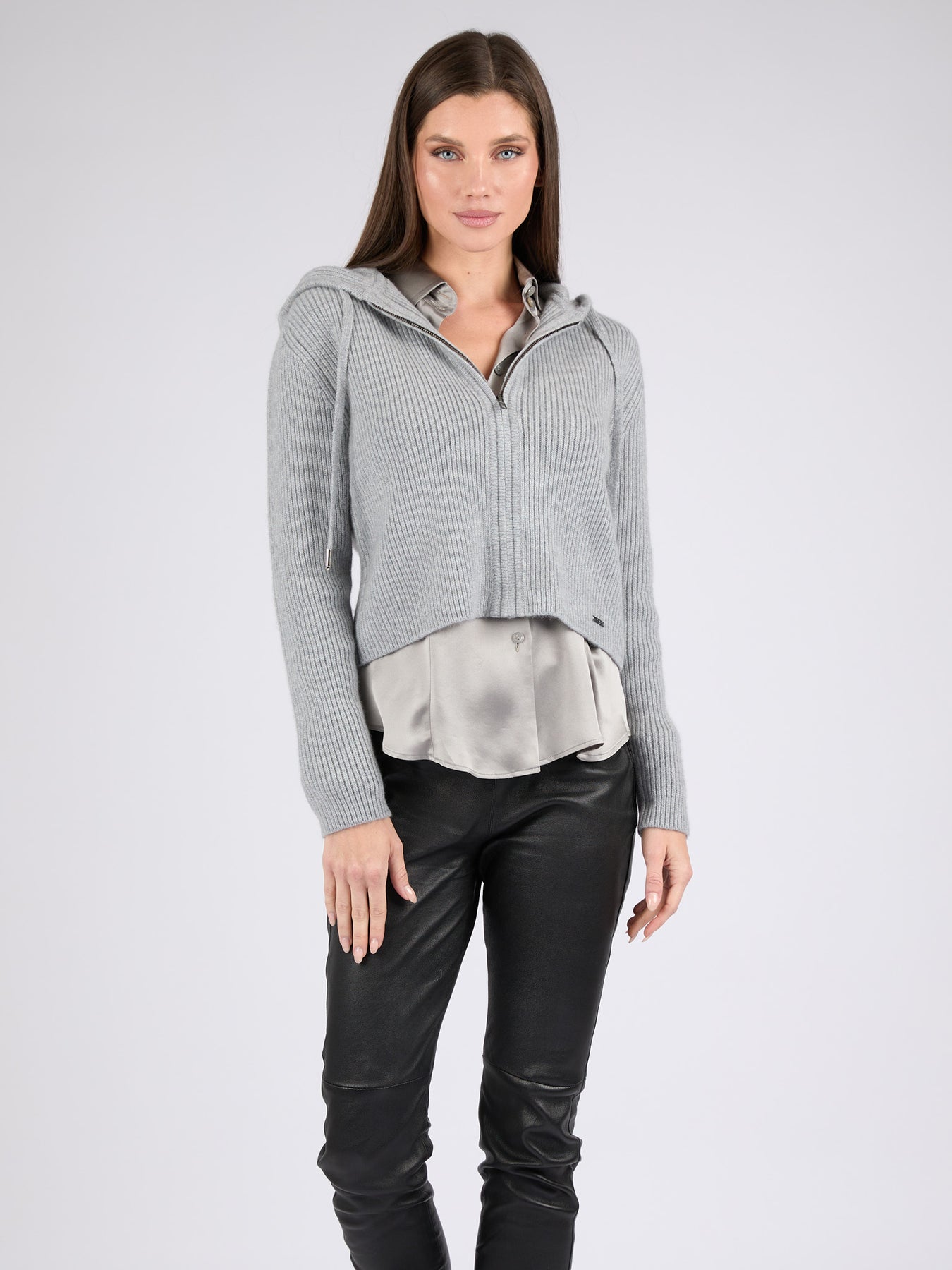 The VERBIER ZIP-UP is a sophisticated cropped hoodie cardigan crafted from 650 grams of pure Mongolian cashmere. Its 4-ply, 5-gauge ribbed knit offers a refined texture and comfortable warmth. Featuring metal-trimmed drawstrings and an exclusive infinity symbol metal tag on a faux suede patch at the lower left back, this waist-length piece embraces minimalist elegance without pockets for a sleek, polished look.